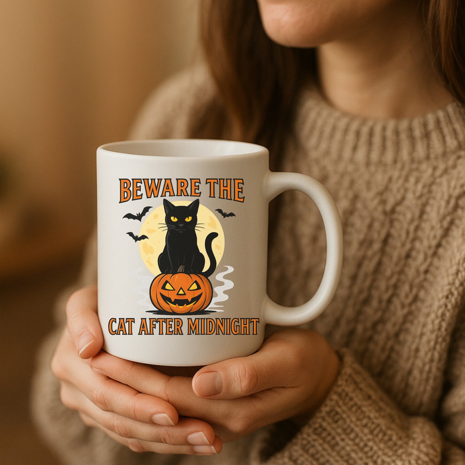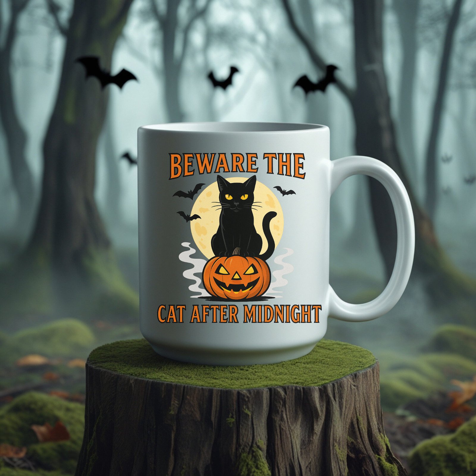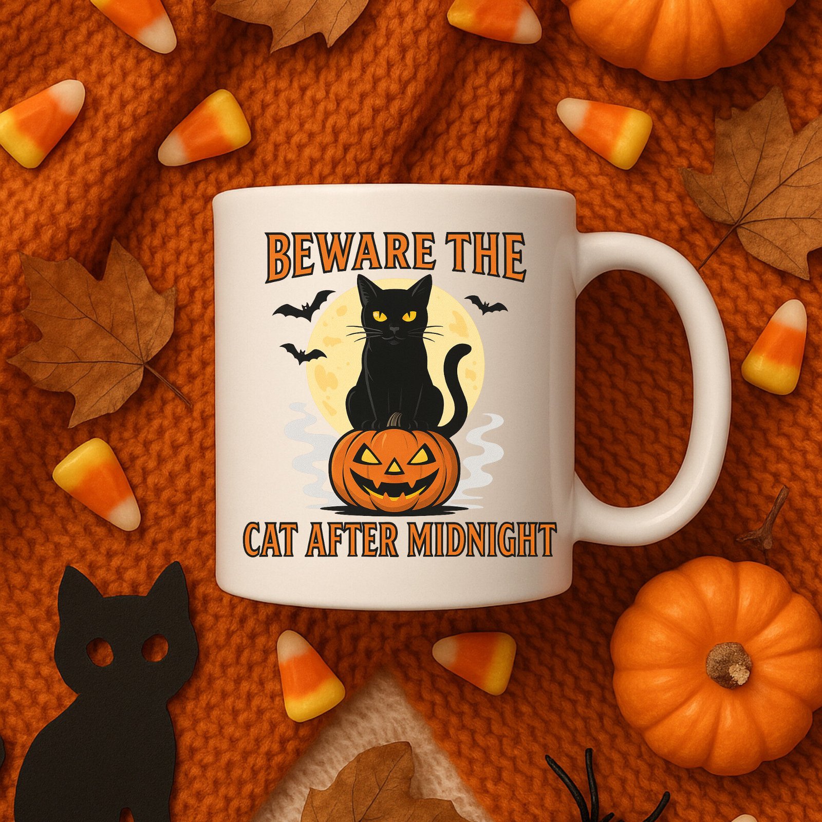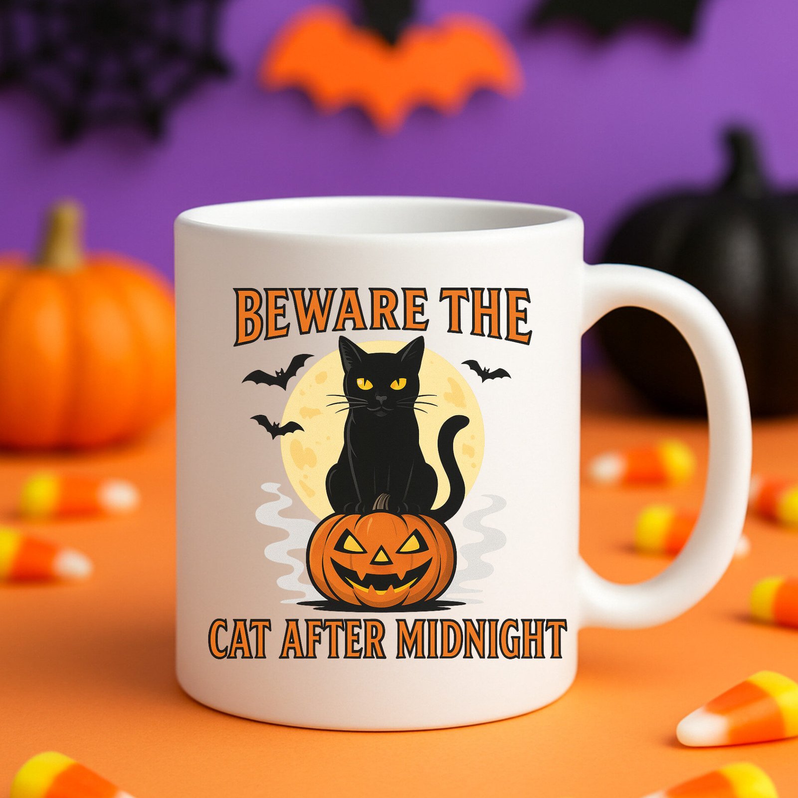 Beware the Cat After Midnight – Funny Cat Lover Halloween Design with Spooky Black Cat Art 11oz White Mug